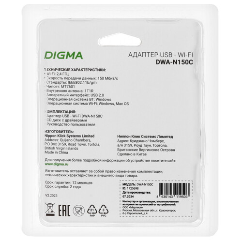 Адаптер Digma DWA-N150C с поддержкой стандарта Wi-Fi 4 (802.11n) оснащается одной интегрированной антенной. Совместимость компонента гарантирована для ПК с операционными системами Linux, Windows версий 7-11 и macOS. Периферийное устройство поставляется в прозрачном блистере.