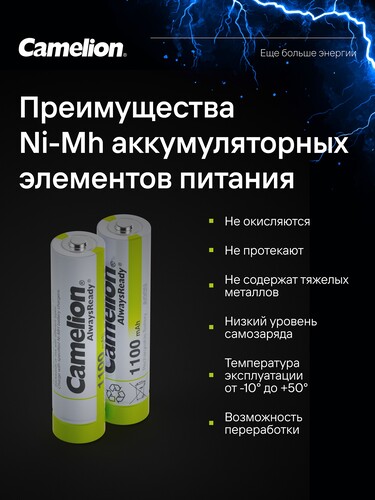 Батарея поставляется в комплекте из 2 штук. Аккумулятор Camelion NH-AAA1100BP2 подходит для эксплуатации в широком диапазоне температур – от -20 до 40 °C. Поставляются заряженными.