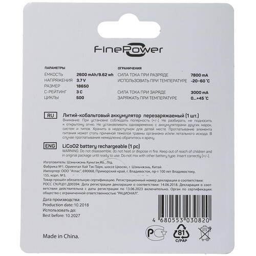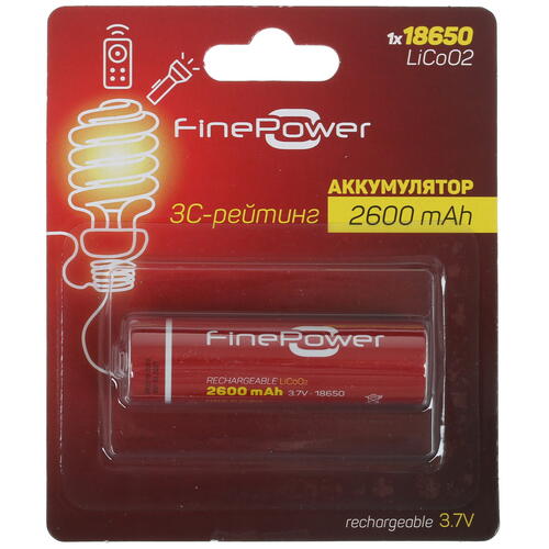 Аккумулятор FinePower [KT-1827] принадлежит форм-фактору 18650 и рассчитан на 500 циклов перезарядки. Последнее обстоятельство указывает на то, что устройство рассчитано на срок службы, достигающий 10 лет. При этом представленная модель предназначена для обеспечения работоспособности всевозможных устройств, от игрушек и пультов ДУ до фонариков. Литиево-кобальтовый аккумулятор имеет емкость 2600 мА. Рабочее напряжение аккумулятора FinePower [KT-1827] составляет 3.7 В. В комплекте поставки предусмотрено 1 устройство.