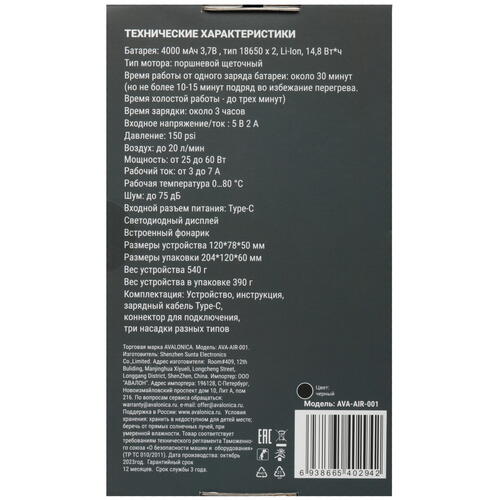 Электронасос аккумуляторный Avalonica AVA-AIR-001 Black [5464196]