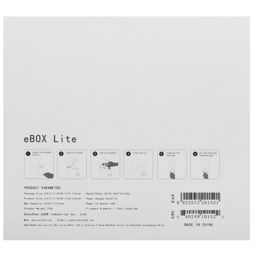 eBOX Lite имеет прозрачную верхнюю крышку из ПК-материала, позволяющую наблюдать за использованием нитей в реальном времени, дугообразный нагревательный лист и металлическая пластина, проводящая тепло, производят более равномерное тепло, что облегчает поддержание постоянной температуры и влажности в помещении, сухой ящик для нити, огнезащитная и теплоизоляционная пена размещена с обеих сторон внутренней части, что безопасно и не допускает ожогов, а также способствует сохранению тепла.