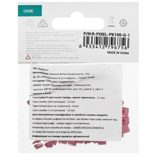 Декоративные элементы DEEPCOOL PIXEL Series – 100 деталей розового цвета, благодаря которым можно превратить решетку корпуса в холст для вашего творчества. С их помощью вы сможете сделать системный блок уникальным и украсить его изображением 8-битного персонажа. Декоративные элементы DEEPCOOL PIXEL Series также могут использоваться для воссоздания эпичных сцен из игровых битв. Для изготовления каждой детали из набора используется резина. Размеры 4.5x4.5x4 мм точно подогнаны для легкой установки в решетки большинства корпусов DEEPCOOL.