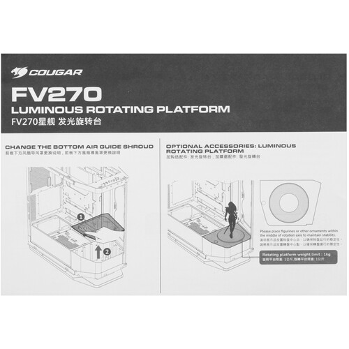 Подставка Cougar FV270 Luminous Rotating Platform выпускается как аксессуар для игрового корпуса-аквариума линейки Cougar с обилием прозрачных элементов. Компонент позиционируется как демонстрационная платформа для коллекционной фигурки или нескольких небольших фигурок. Монтируемая прямо внутри компьютерного корпуса подставка подсвечивает фигурки снизу и обеспечивает их вращение. Для этого в основание аксессуара встроены ARGB-светодиоды.