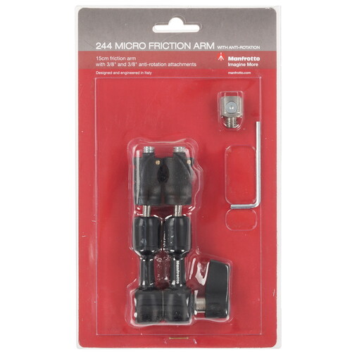 Manfrotto 244MICRO-AR - многофункциональный фрикционный кронштейн (длина плеча кронштейна - 15 см) с креплением блокирующим вращение и дополнительным переходником на 3/8 дюйма. Система блокировки вращения совместима со штативами Manfrotto 055 и 190 серии и специальным зажимом 386B-1 Nano Clamp. Уникальная форма крепления блокирующего вращение позволяет надежно зафиксировать оборудование таким образом, что кронштейн не будет больше вращаться. Крепления могут быть легко заменены с помощью входящего в комплект шестигранного ключа.