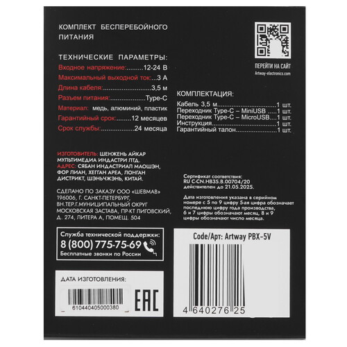 Комплект бесперебойного питания Artway PBX-5V [9203731]