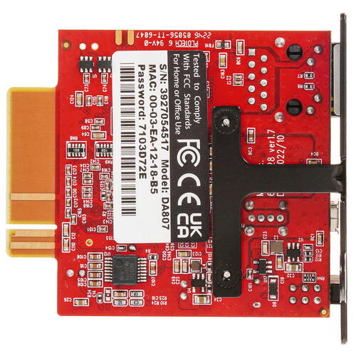 Модуль Powercom DA807 является SNMP-адаптером, который устанавливается в ИБП Powercom серий SPT, KIN, SRT, MRT и MAC. С его помощью можно наблюдать за режимами работы и параметрами ИБП по компьютерной сети. Это обеспечит безопасную работу подключенного к ИБП оборудования. Взаимодействие модуля с устройством бесперебойного питания осуществляется по внутреннему протоколу обмена, в процессе которого он получает информацию об изменениях в работе ИБП.