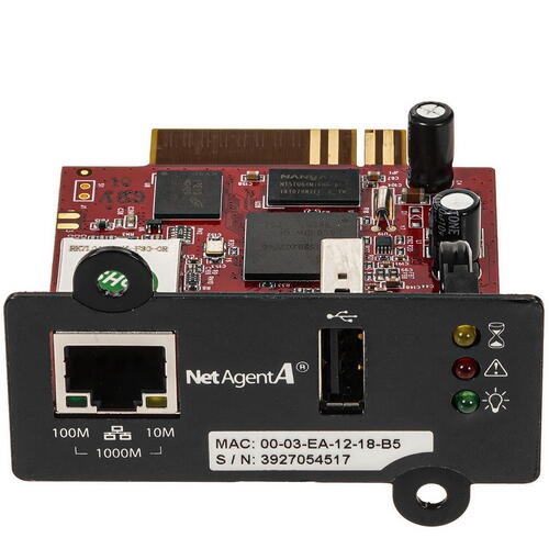 Модуль Powercom DA807 обладает расширенными функциями, что предусматривает его способность сохранять данные, устанавливать время, ограничивать доступ по IP-адресам, уведомлять о событиях по электронной почте или через Trap-сообщения. На внешней панели модуля находятся разъемы USB и RJ-45, а также световые индикаторы для определения текущего состояния устройства.