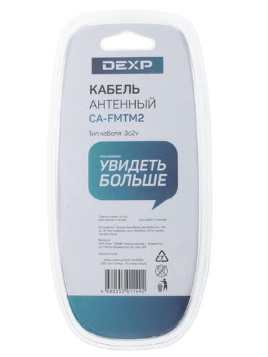 Антенный кабель DEXP 3C2V TV - F обладает стандартной конструкцией. Оба его конца оборудованы разъемами-вилками. Один из них представлен видом TV - он используется для подключения кабеля к телевизору. Второй штекер относится к виду F-разъемов. Данная модель обеспечит стабильную передачу телевизионного сигнала без прерываний и помех. Качественная оплетка из ПВХ гарантирует долговечность изделия и максимальную защиту от механических повреждений.