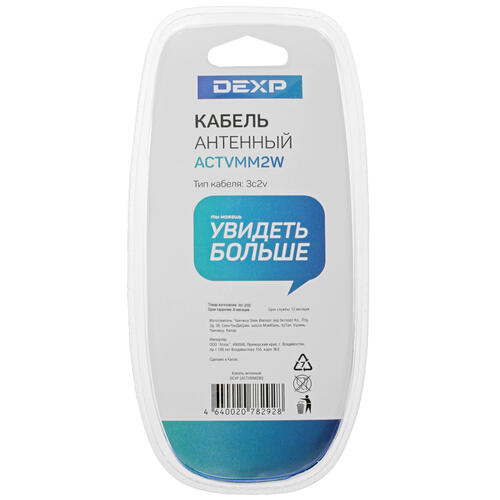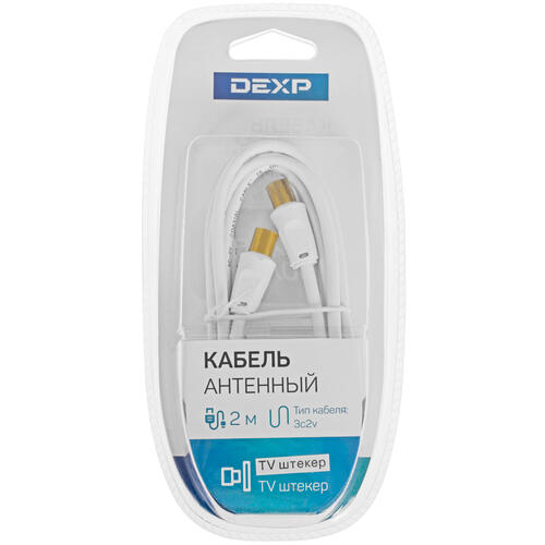 Кабель антенный DEXP TV - TV может использоваться не только для организации передачи телевизионного сигнала. Также он может эксплуатироваться в качестве удлинителя для ТВ-провода. Задержка в передаче ТВ-сигнала будет сведена к минимуму благодаря представленному аксессуару. Оснащение этого кабеля довольно стандартное: оба конца оборудованы разъемами TV, относящимися к виду "вилка". Оптимальная длина аксессуара, достигающая двух метров, предоставляет вам свободу во время подключения ТВ-устройств.