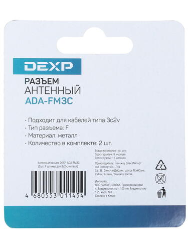 Антенный разъем DEXP F - 3C2V позволит владельцу телевизора подключить к нему антенный кабель, чтобы в дальнейшем наслаждаться любимыми телевизионными передачами и "свежими" кинолентами. Основным достоинством данной модели является присутствие в комплекте сразу двух изделий, благодаря чему вы сможете подсоединить с их помощью сразу два антенных кабеля к двум телевизорам в вашей квартире. Изготовленные из качественного сплава металлов разъемы невероятно долговечны в использовании: они на протяжении многих лет смогут радовать вас своей безупречной службой.