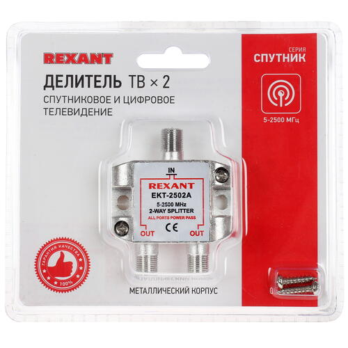 Сплиттер антенный REXANT 05-6201 разделяет спутниковый и цифровой сигналы на 2 направления равными частями. Это актуально в том случае, если его будет нужно транслировать сразу на 2 телевизора, находящиеся в разных помещениях, без потери качества и четкости. Металлическая модель имеет один вход и 2 F-разъема для выхода сигнала. Работает сплиттер антенный REXANT 05-6201 в полосе пропускания частот 5–2500 МГц. В комплекте реализации есть необходимая для установки комплектующего фурнитура. Поставляется антенный сплиттер в герметичной заводской упаковке.