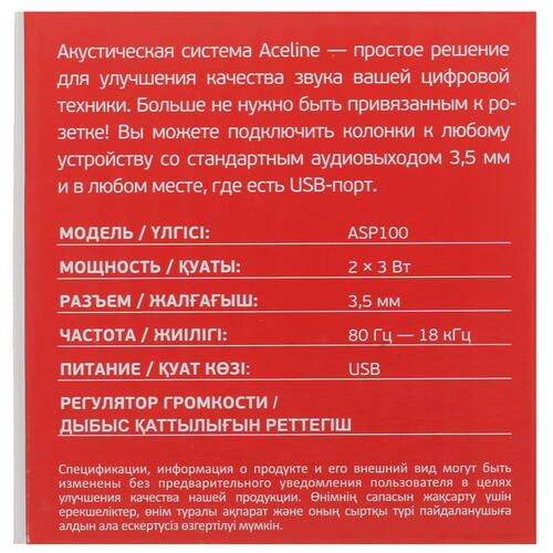 формат акустики - 2.0, jack 3.5 мм, питание - от USB
