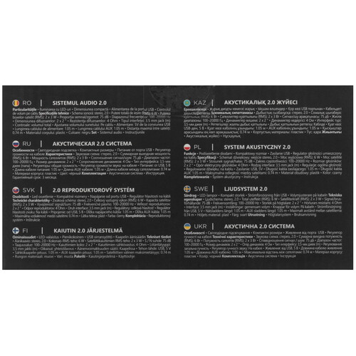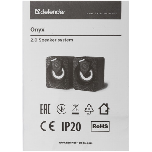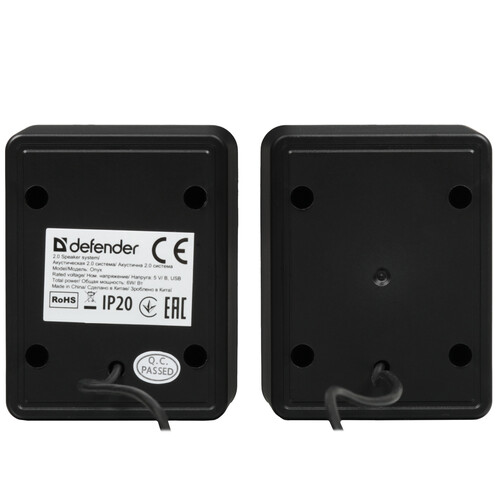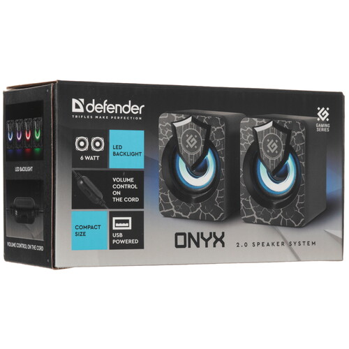 Defender Onyx - компактные компьютерные колонки со светодиодной подсветкой. Колонки не требуют сетевого источника питания. Просто подключите колонки к USB-разъему компьютера и наслаждайтесь звуком. Колонки необходимо подключить также к аудиоразъему вашего персонального компьютера, поскольку данная модель не оборудована интегрированной звуковой картой
