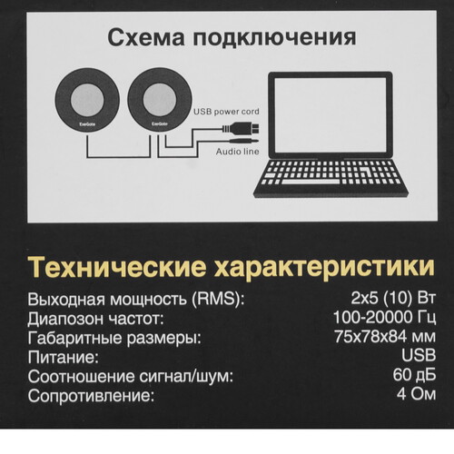 Колонки ExeGate Disco 150 порадуют и своей громкостью благодаря суммарной мощности 10 Вт. Стереосистема с соотношением сигнал/шум 60 дБ может быть подключена к любому источнику звука при помощи 135-сантиметрового кабеля с традиционным интерфейсом 3.5 mm jack на конце. Корпуса колонок выполнены из качественного пластика – практичного материала, отличающегося легкостью и долговечностью. Размеры акустики – 82x85x85 мм (ширина, высота и глубина соответственно).