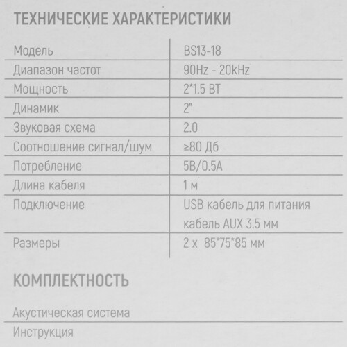 Компактная акустическая система TFN BS13-18BL - это стильное решение для вашего рабочего пространства. Обладая общей мощностью 3 Вт, колонки выдают чистое и хорошее звучание, поддерживая воспроизведение в диапазоне 90Hz - 20kHz.