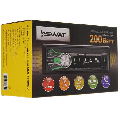 Особенностью автопроигрывателя Swat MEX-1042UBG стала поддержка беспроводного подключения Bluetooth, благодаря которому можно транслировать музыку со смартфона на это устройство. Модель также способна воспроизводить MP3-файлы, записанные на флешку или карту памяти, при помощи интерфейса USB на лицевой панели и кард-ридера. Сегментный дисплей с зеленой подсветкой обеспечит удобство при настройке параметров работы устройства, а в темное время суток все его элементы управления подсвечиваются белым светом.