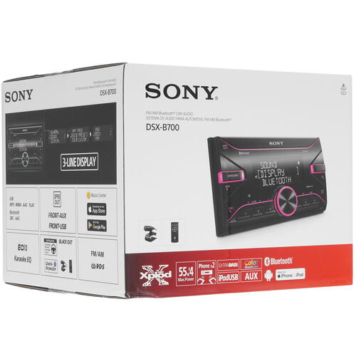 Соответствующий типоразмеру 2DIN автопроигрыватель Sony DSX-B700 способен обеспечить безупречное качество звука в автомобиле с любым типом салона. Максимальная выходная мощность устройства – 220 Вт (55 Вт на канал). Проигрыватель рассчитан на взаимодействие с планшетами и смартфонами, работающими под управлением Android и iOS. Мобильные устройства могут использоваться для воспроизведения музыки. Возможна и телефонная связь без помощи рук: голос собеседника в этом случае выводится на штатную аудиосистему транспортного средства. Расположенный на лицевой панели устройства USB-порт подходит для подключения флеш-накопителя. Для воспроизведения также можно воспользоваться линейным входом.