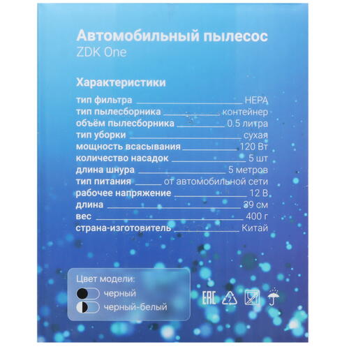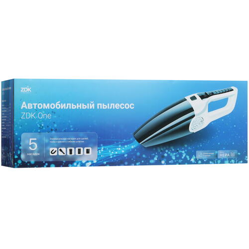 Автомобильный пылесос ZDK Simple One с потреблением 12 Вт работает от бортовой сети авто. Мощности всасывания хватает для очистки салона и ковриков от ворса, шерсти, пыли и прочих загрязнений. Длины кабеля 5 м хватает для ухода за передними и задними сиденьями.