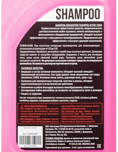 Автошампунь для бесконтактной мойки Verton Shampoo Active Foam представляет собой концентрированное моющее средство, которое используется для бесконтактной мойки легковых и грузовых автомобилей. Тщательно подобранный состав позволяет легко удалить с поверхности кузова пыль, грязь, масло и следы от насекомых, при этом средство не наносит химических и механических повреждений лакокрасочному покрытию. Благодаря антикоррозийным добавкам кузов автомобиля будет защищен от ржавчины. После нанесения средство Verton Shampoo Active Foam легко смывается. Поставка автошампуня производится в бутылке, которая вмещает в себя 1 л средства.