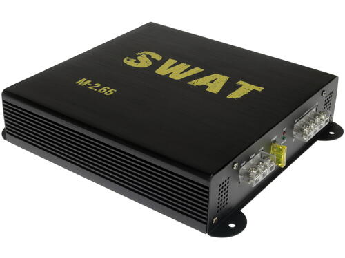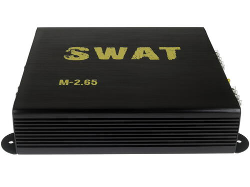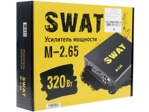 Двухканальный SWAT M-2.65 выдает 130 Вт мощности при сопротивлении 4 Ом. этом частоты воспроизведения располагаются в воспринимаемом человеческим ухом диапазоне - от 10 до 20000 Гц. В конструкции устройства присутствует регулятор для настройки уровня баса.