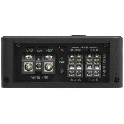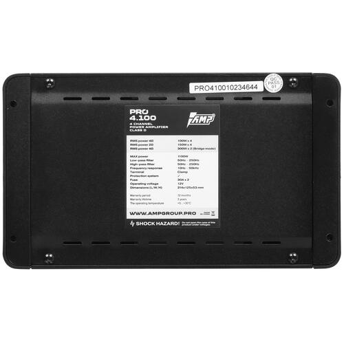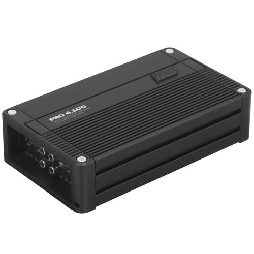 4-канальный усилитель AMP Pro 4.100 подходит для обслуживания мощной акустической системы в автомобиле с любым типом кузова. Устройство отличается высокой энергоэффективностью: оно соответствует классу D. Модель поддерживает широкий частотный диапазон – от 10 Гц до 50 кГц.
