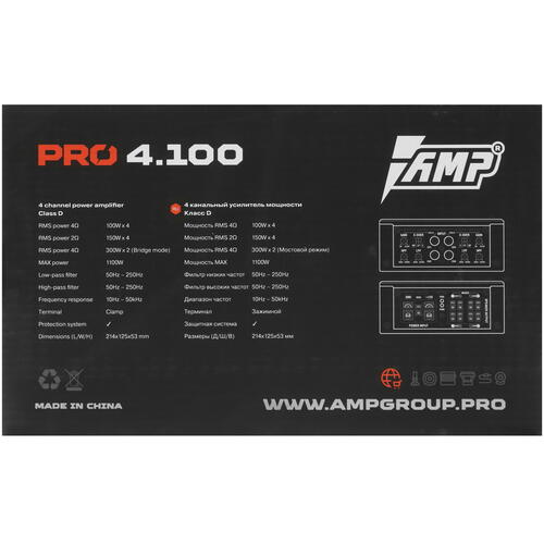 Номинальная мощность усилителя AMP Pro 4.100 при сопротивлении нагрузки 2 Ом составляет 600 Вт. Показатель для 4 Ом равен 400 Вт. Возможно мостовое подключение с мощностью до 300 Вт на канал.