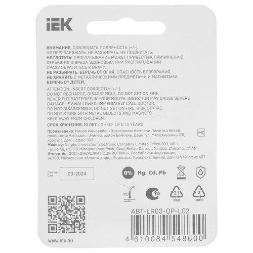 Батарейка IEK AAA / AAA (LR03/FR03) не содержит кадмия, ртути и свинца. Изделие рассчитано на использование в широком температурном диапазоне – от -20 до 50 °C. Количество батареек в комплекте – 2.