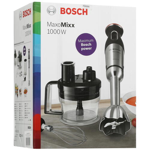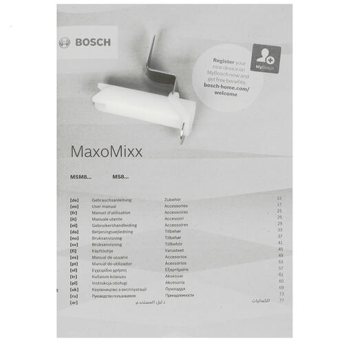 Блендер Bosch MS8CM6190 имеет импульсный режим, который позволяет быстро получить оптимальную консистенцию смеси. Всего в комплектации предусмотрено четыре насадки, в том числе измельчитель, венчик для взбивания, терка-шиновка и приспособление для замешивания теста. Для удобства есть мерный стакан объемом 600 мл.