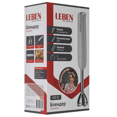 LEBEN представляет блендер мощностью 400 Вт с удобной съемной ручкой и ножом из нержавеющей стали для качественного измельчения и смешивания продуктов. Устройство имеет две скорости работы для разных видов продуктов. На коробке блендера вы найдете рецепт, который поможет вам приготовить разнообразные блюда. Работает от электросети с напряжением 220-240 В.