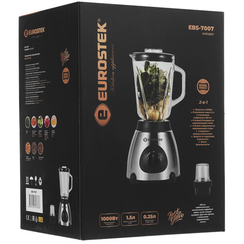 Блендер стационарный Eurostek EBS-7007 прост в обращении – у него есть 2 скорости работы и 1.5-литровый стеклянный кувшин для смешивания/измельчения ингредиентов. Крестообразный нож прибора изготовлен из нержавеющей стали – он не боится даже самых твердых продуктов, включая кофейные зерна. Для последнего у прибора есть специальная насадка. Блендер поддерживает опцию добавления продуктов во время работы. Eurostek EBS-7007 защищен от перегрева. Против скольжения по рабочей поверхности помогают прорезиненные ножки.