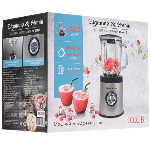 Блендер стационарный Zigmund & Shtain BS-441 D – стильный и функциональный помощник на кухне. Он позволяет быстро измельчать и смешивать продукты в однородную массу. Пять скоростных режимов с простым управлением обеспечивают плавную регулировку интенсивности обработки. Прибор выполнен в корпусе из нержавеющей стали и оборудован стеклянной чашей объемом 1.5 л. На основании расположены прорезиненные ножки-присоски для прочной фиксации на поверхности. Технология защиты от перегрузки делает эксплуатацию Zigmund & Shtain BS-441 D более безопасной.