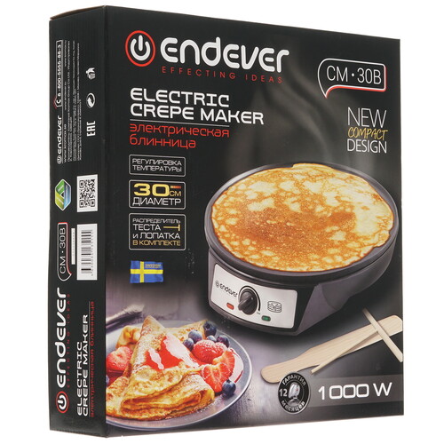 Электрическая блинница Endever СM-30B упростит приготовление вкусного заправка для всей семьи. Сковорода позволяет готовить вкусные и румяные блинчики диаметром по 30 см. Устройство с максимальной мощностью 1000 Вт дополнено антипригарным покрытием и удобным регулятором уровня нагрева.