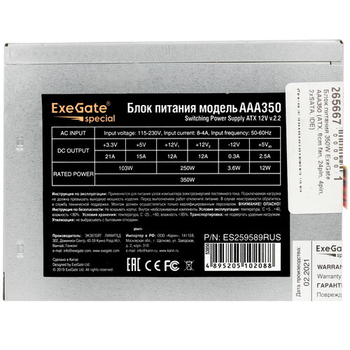 Блок питания ExeGate AAA350 [ES259589RUS] оптимизирован для использования в системных блоках начального уровня. Данная модель выполнена в полноразмерном форм-факторе ATX и обладает номинальной мощностью 350 Вт. В оснащение блока питания входят по одному разъему 20 + 4 pin и 4 pin, 2 разъема 15-pin SATA, 1 разъем 4-pin Molex. В конструкции ExeGate AAA350 имеется вентилятор диаметром 80 мм, который эффективно отводит тепло и предотвращает перегрев устройства при различных нагрузках. Компоненты высокого качества и технологии защиты гарантируют стабильную работу блока питания.