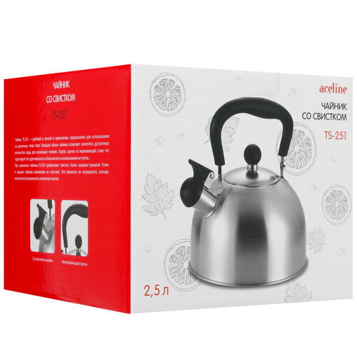 Чайник для плиты Aceline TS-251 − это очень полезное приспособление для тех, кто любит горячий чай или кофе по утрам. Вместе с этим чайником будет пробуждаться вся семья, ведь о закипании воды он сигнализирует, используя встроенный в носик свисток. Модель обладает объемом 2.5 л, поэтому вы сможете вскипятить за один раз достаточно воды, чтобы приготовить каждому любимый напиток. Вода в чайнике нагревается очень быстро благодаря капсулированному дну, содержащему алюминиевую прослойку.