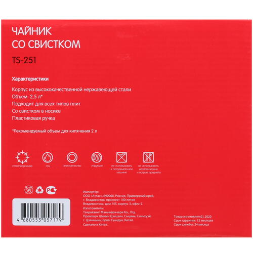 Чайник для плиты Aceline TS-251 серебристый [1612226]