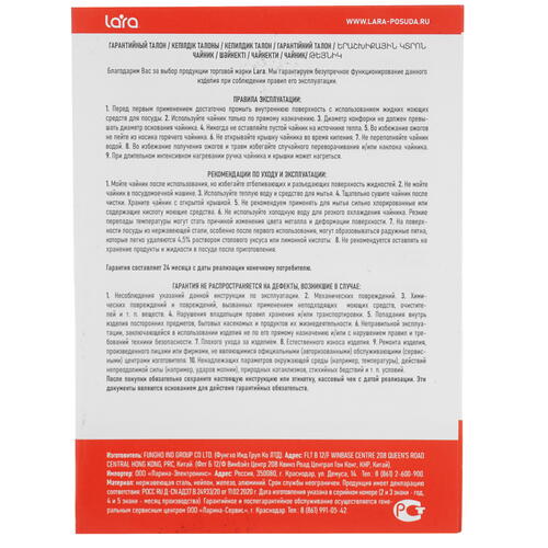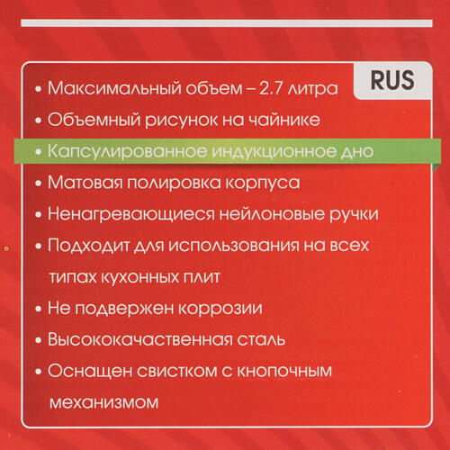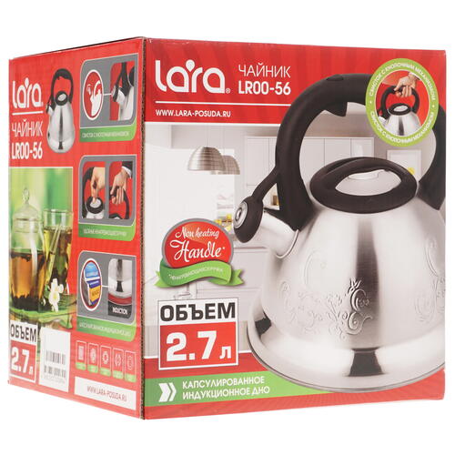Конструкция с утолщенным капсулированным дном делает чайник Lara LR00-56 совместимым со всеми типами плит – электрические, газовые, индукционные. Крышка и ручка из термостойкого пластика защищают руки от высокой температуры нагрева. Установленный в носике свисток оповещает звонким сигналом о закипании воды и помогает вовремя снимать чайник с плиты.