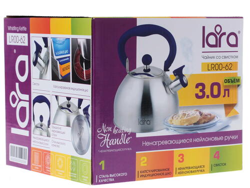 Чайник для плиты Lara LR00-62 оснащен специальным свистком, благодаря которому вы оперативно узнаете о закипании жидкости, находящейся в основном 3-литровом резервуаре устройства. несомненное достоинство модели Lara LR00-62 – наличие ручки из особого материала, который не подвержен нагреву в процессе работы чайника. Таким образом, вы сможете раз и навсегда забыть об использовании прихваток при снятии чайника с плиты.