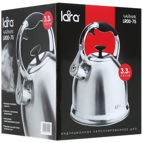 Чайник для плиты Lara LR00-75 имеет объем 3.3 л. Предусмотрена поддержка конфорок любого типа, в том числе – индукционных. Установлена нейлоновая ручка, которая не подвержена нагреву. Риск ожога будет минимизирован. Цвет чайника – серебристый. Роль упаковки исполняет коробка, имеющая эффектный дизайн.