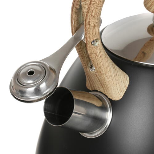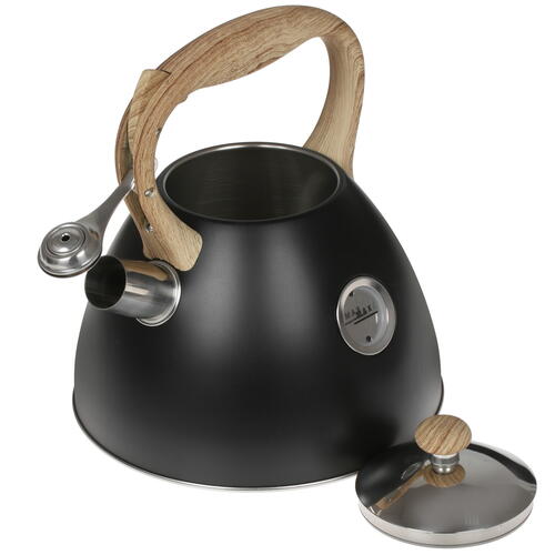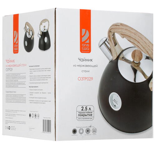 Чайник для плиты OneTwo O3TP029 изготавливается из нержавеющей стали, которая обладает высокими показателями проводимости тепла. За счет этого нагревание происходит быстрее. Основной цвет – матовый черный с коричневой ручкой и крышкой. Объем прибора – 2.5 л. Поддерживает плиты всех типов, в том числе индукционные. Дополнительно корпус оснащен шкалой уровня воды, которая поможет избежать превышения заявленного производителем объема. Габариты чайника для плиты OneTwo O3TP029 таковы: 22.5x24.5 см (ширина и высота). Вес составляет всего 0.94 кг.