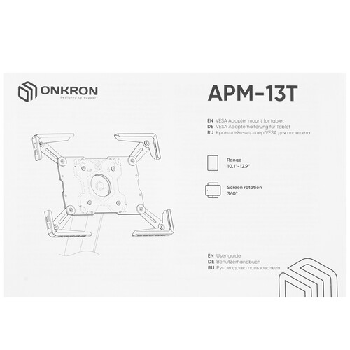 Универсальный адаптер для планшета ONKRON APM-13T подходит для большинства планшетов. Вы легко сможете разместить любой планшет или электронную книгу с диагональю до 12.9 дюймов. Этот держатель подарит вам уникальную возможность – совмещать вашу работу, занятие спортом или хобби с возможностью наслаждаться любимыми фильмами, сериалами и заходить в мобильные приложения, общаться по видеосвязи, и всё это – без помощи рук.