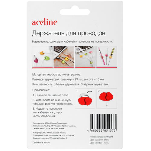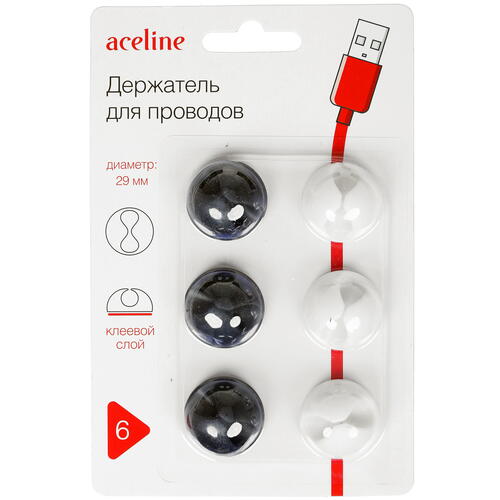 Держатель для проводов Aceline поставляется в количестве 6 штук. В комплект входят по 3 держателя белого и черного цветов. Диаметр аксессуара равен 29 мм, а высота – 15 мм. Роль упаковки комплекта держателей играет блистер. На обратной стороне упаковки размещена инструкция по установке.