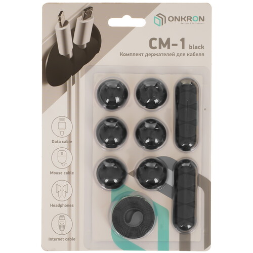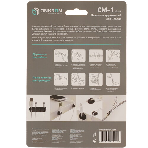 Держатель для проводов ONKRON CM-1 удерживает кабели в фиксированном положении, защищает их спутывания, перегибов и механических воздействий. Благодаря клейкому покрытию клипсы прочно располагаются на вертикальных и горизонтальных поверхностях, удобны в применении и пригодны для многоразового использования. Они подходят для любого кабеля толщиной до 0.5 см. Держатель ONKRON CM-1 изготовлен из резины черного цвета. В комплекте предусмотрена лента-липучка для упорядоченной укладки кабелей от цифровой техники и периферийных устройств.