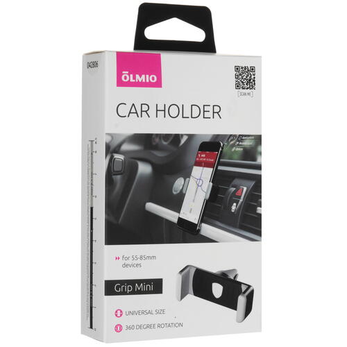 Автомобильный держатель Olmio Grip Mini фиксирует смартфон на вентиляционной решетке для защиты от случайного падения устройства и удобного просмотра входящих звонков и оповещений. Поддержка вращения на 360° позволяет поворачивать экран под нужным углом для просмотра нужной информации. Аксессуар подходит для устройств шириной 55-85 мм.