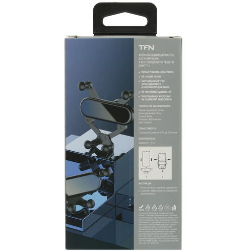 Держатель автомобильный TFN Gravity 2 обеспечивает прочную фиксацию мобильного устройства шириной 70-100 мм и удобный просмотр информации на экране во время поездок. Он изготовлен из прочного пластика, поэтому устойчив к повреждениям. Держатель гравитационного типа плотно удерживает смартфон при помощи боковых фиксаторов и предотвращает его падение при езде на неровных дорожных покрытиях. Держатель TFN Gravity 2 устанавливается на вентиляционную решетку в салоне автомобиля при помощи зажимного механизма.