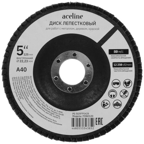 Диск лепестковый Aceline FDN0120 предназначен для абразивной обработки древесины и металла. Изделие используется при оснащении УШМ и устанавливается на фланец. Наружный диаметр инструмента – 125 мм. Зернистость диска – P40. Частота вращения не должна превышать 12250 об/мин.
