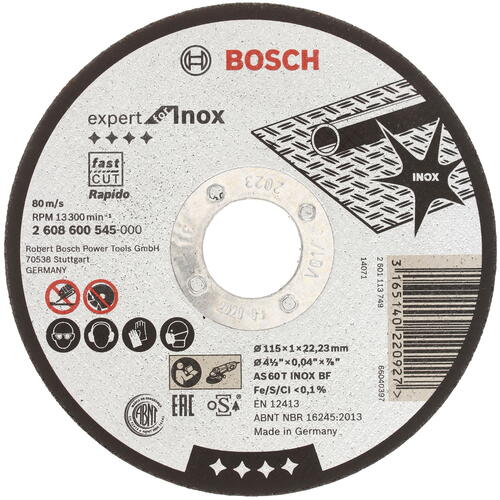 Диск отрезной Bosch 2608600545 – оснащение от не нуждающегося в каких-либо рекомендациях производителя инструментов. Изделие будет полезно владельцам угловых шлифовальных машин, которые рассчитаны на использование 115-миллиметровых дисков. Инструмент, имеющий сплошную конструкцию, предназначен для резки изделий из нержавеющей стали. Максимально допустимая частота вращения – 13300 оборотов в минуту.