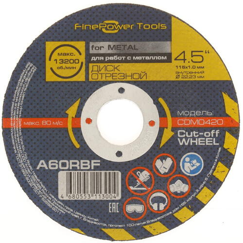 Диск отрезной FinePower CDM0420 использует в своей основе качественные материалы и передовые технологии, что обеспечит высокую надежность и позволит выполнять даже сложные и длительные работы без риска деформации. Скорость вращения инструмента может достигать 13200 об/мин, благодаря чему вы сможете быстро и качественно производить распил материала. Внешний диаметр оснастки составляет 115 мм, а ее толщина не превышает 1.6 мм. Диск отрезной FinePower CDM0420 поставляется поштучно. При выполнении работ обязательны средства защиты.
