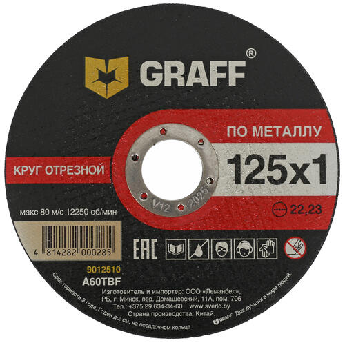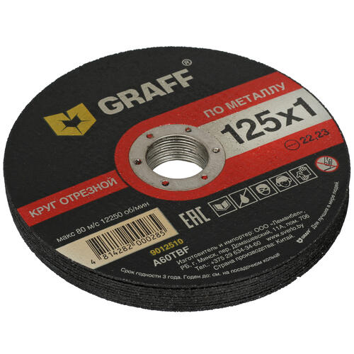 Набор отрезных дисков Graff 9112510 предназначен для резки по металлу, чугуну, пластику. Он подходит для установки в УШМ и болгарки с частотой вращения до 12200 об/мин, в которых предусмотрено посадочное отверстие 22.23 мм. Абразивное покрытие на бакелитовой связке обеспечивает высокую производительность при резке материала. Благодаря двойной стекловолоконной сетке повышается прочность конструкции и ее устойчивость к деформации при нагрузках. В наборе Graff 9112510 предусмотрены 10 отрезных дисков с внешним диаметром 125 мм, которые поставляются в футляре для удобного хранения.
