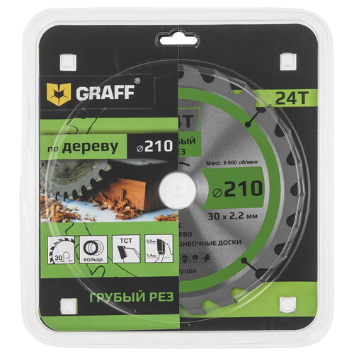 Пильный диск по дереву 210x1.4/2.2x30/25.4/20/16 мм, 24Т, черновая обработка GRAFF 21221024 предназначен для поперечного или продольного распила древесины, бруса или обшивочных досок.