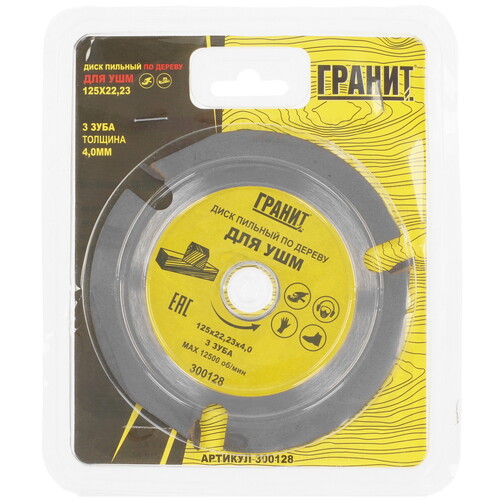 Диск пильный Гранит 300128 – оснащение для дисковых пил. Инструмент с 3 зубьями используется при пилении ДВП, ДСП, дерева и фанеры. Посадочный диаметр диска равен 22.23 мм, а наружный диаметр – 125 мм. Изделие рассчитано на частоту вращения не более 12500 об/мин.